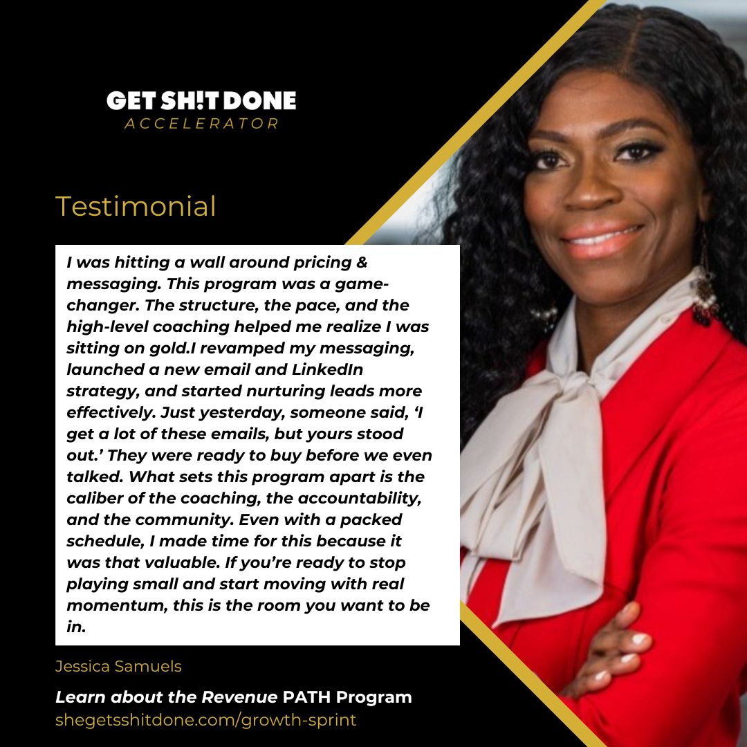 The Get Sh!t Done Growth Sprint: Revenue PATH Program is a 4-week execution sprint designed to help you generate revenue now. You’ll build a custom revenue roadmap, master high-impact sales strategies, and take immediate action, with support from seasoned entrepreneurs who have successfully scaled to the level you are ready for.